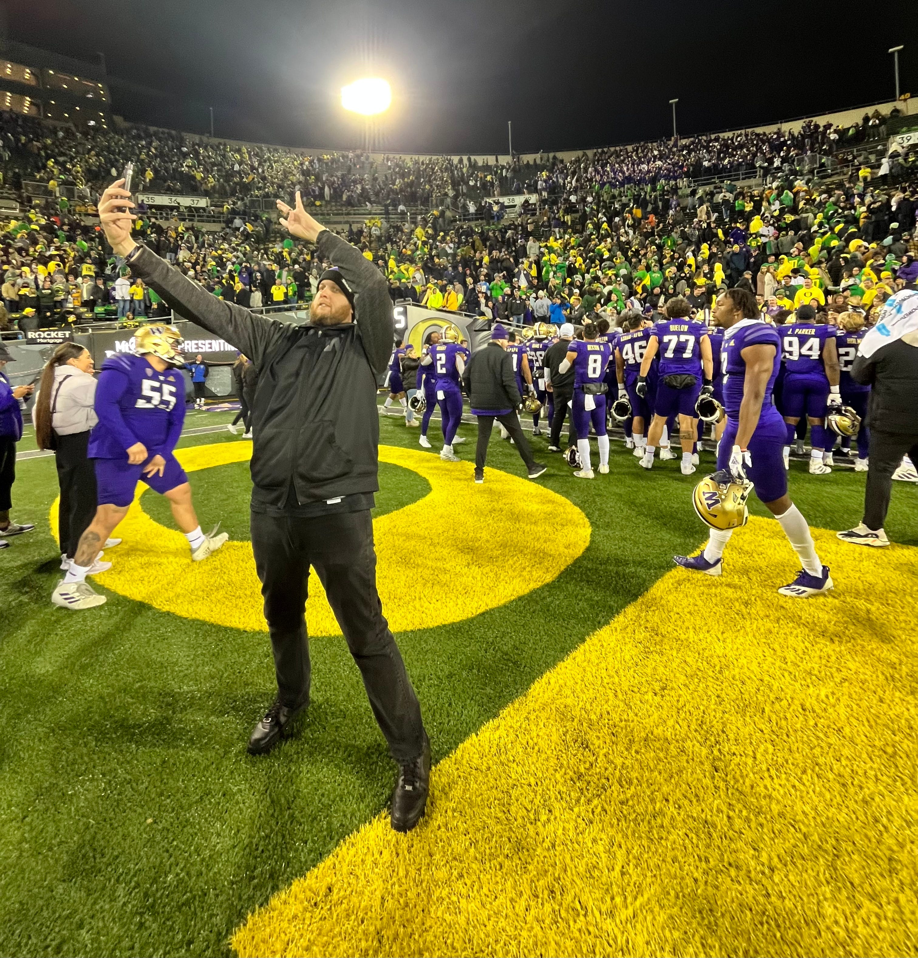 EUGENE — After Noah Whittington’s foot slipped and fourth-and-1 became first-and-10 for the Huskies and a game that seemed like it would never end finally saw the light, Washington defender Sav’ell Smalls skipped up and down the Washington sideline locked in a battle with seemingly each of the 58,756 Oregon fans who filled Autzen Stadium on a November night none of them will ever forget.