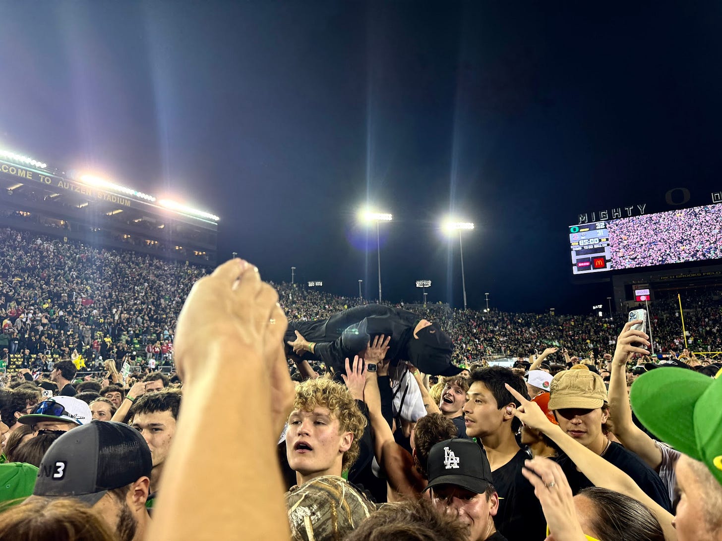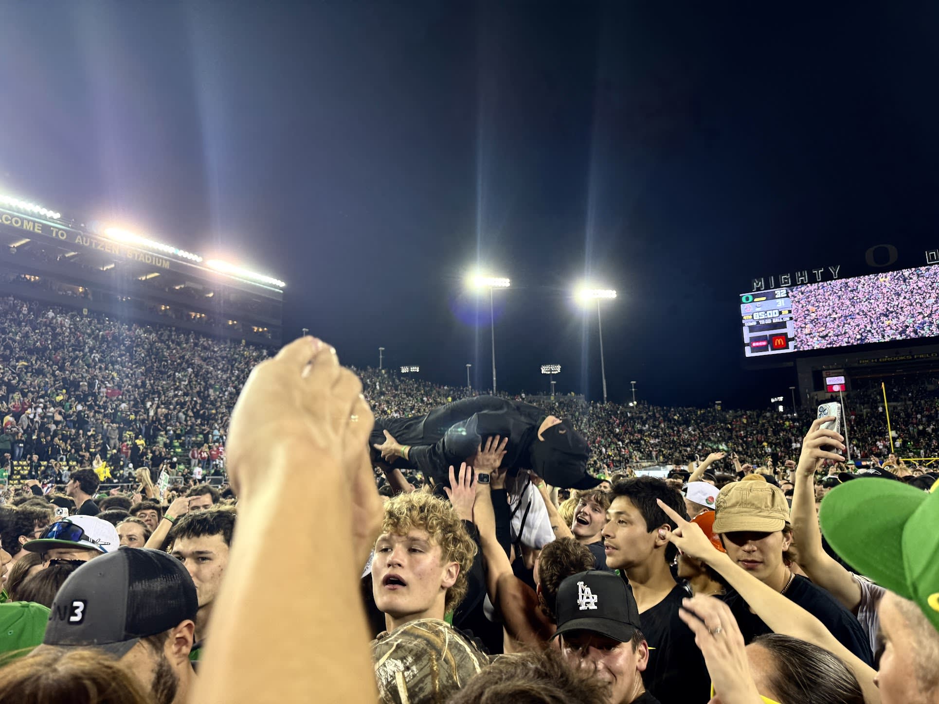 Mainly, I remember Dan Lanning being swallowed by the crowd on Oct. 12. The Ducks had beaten Ohio State, they were on their way to being No. 1 and Autzen Stadium had exploded into a jubilation that will rank as one of the best parties in this state’s sporting history. 50,000 people rushed the field and 100,000 more will say they did as Oregon’s players and coaches were swarmed by fans, writers, photographers, the Duck, Batman and a host of crowd surfers.